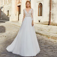 Hot Sale 2021 New A-Line Wedding Dresses Illusion V Neck Three-Quarter Sleeve Backless Tulle Plus Size Applique Floor Length