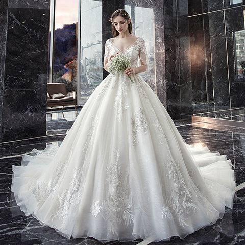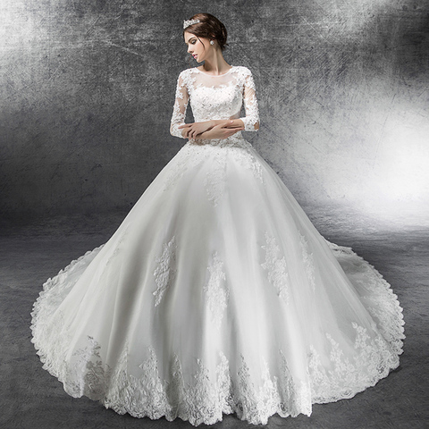 Princess Wedding Dress With Picture Veil Brautkleid Boat Neck Three Quarter Sleeve Appliques Lace Beading White Bride Gowns