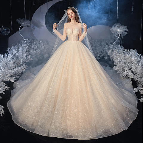 New Arrivals O-Neck Lace up Back Long Sleeve Full Beading Sequines Super Shiny Princess Ball Gown Wedding Dresses