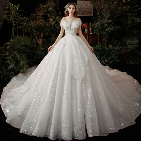 Supper Gorgeous Shiny Crystal Lace Ball Gown Wedding Dress Wih Chapel Train V-neck Bow Shoulder Princess Bridal Dresses