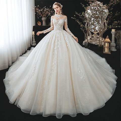 New Arrivals High Neck Long Sleeve Beading Appliques Flowers Super Shiny Ball Gown Wedding Dresses Robe De Soiree De Mariage