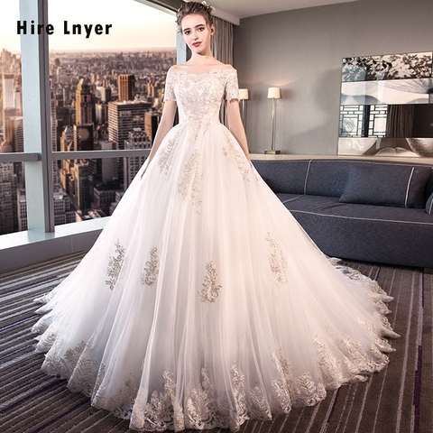 Robe De Mariage New Arrivals Boat Neck Short Sleeve Lace up Back Gold Appliques Ivory Ball Gown Wedding Dress Alibaba Gelinlik