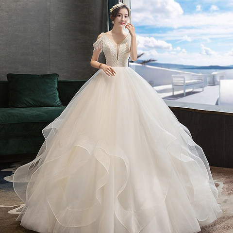 Dee's Sexy Princess Ball Gown Wedding Dresses V-Neck Lace Back Shiny Beading Sequined Appliques Plus Size Robe De Soiree De