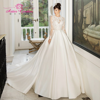 Aster Garden A-Line Wedding Dress 2021 Elegant Satin Long Sleeve Scoop Beaded Lace Button Vintage Bride Gowns Vestido De Novia