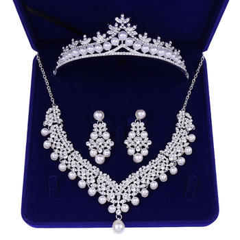 New Bridal Necklace Earrings Three-Piece Set Pearl Tiara Crown Wedding Accessories Wholesale